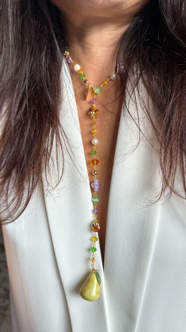 Hecho a mano en Italia, el collar Pera combina la delicadeza de la cerámica con el encanto natural de la fruta mediterránea. El colgante de pera esmaltada, modelado y pintado a mano, se convierte en el protagonista de una pieza llena de luz y color.