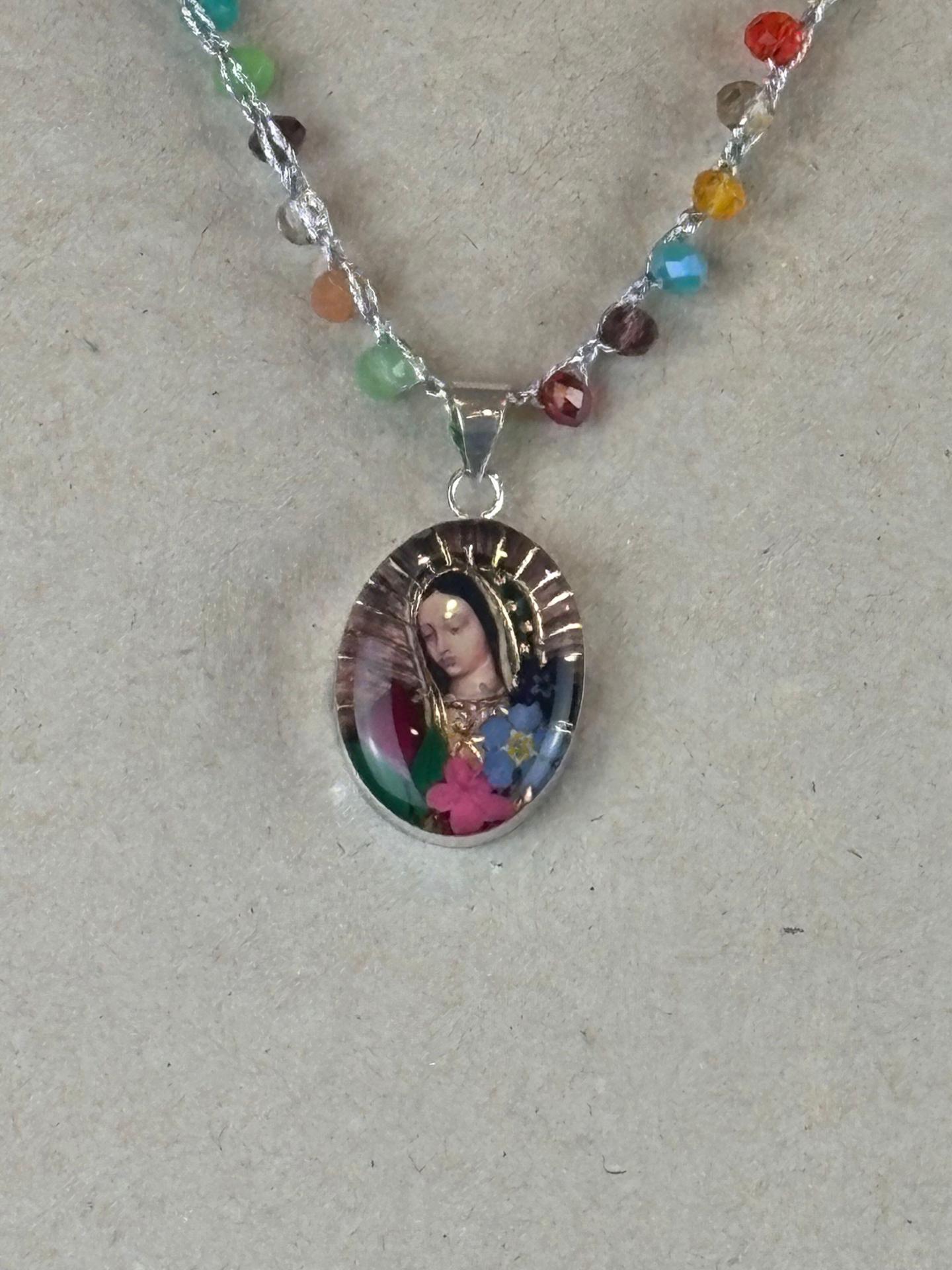Dije de la Virgen de Guadalupe con flores disecadas y plata