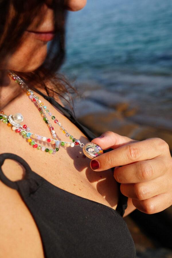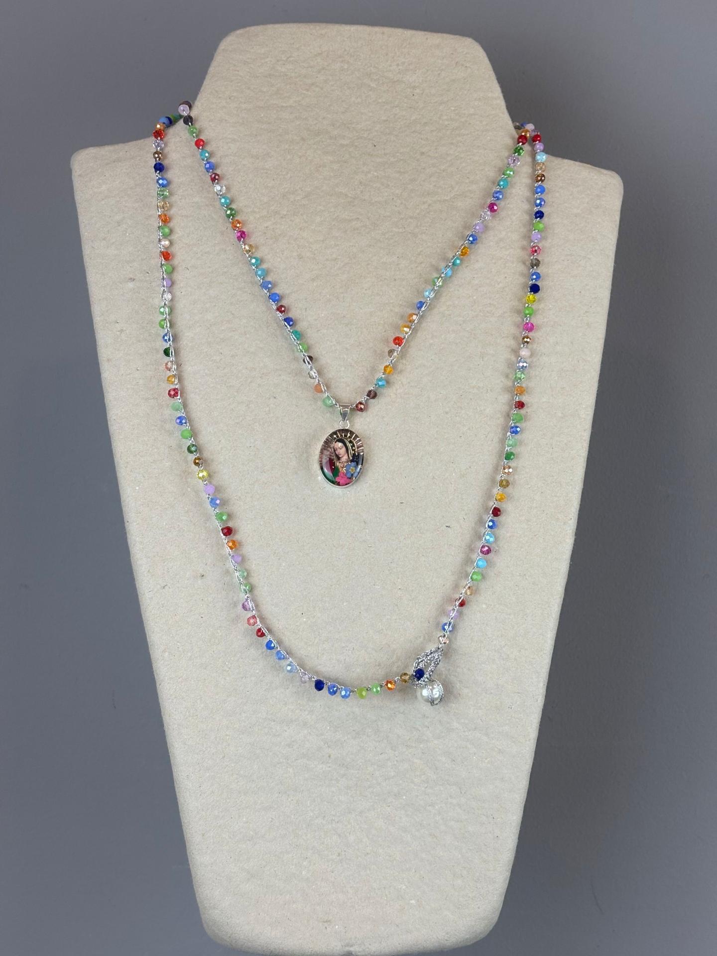 El dije cuelga de un collar tejido a mano, elaborado con cristales corte Swarovski que brillan con cada movimiento. Cada collar es una obra artesanal única: colorido, luminoso y profundamente mexicano.