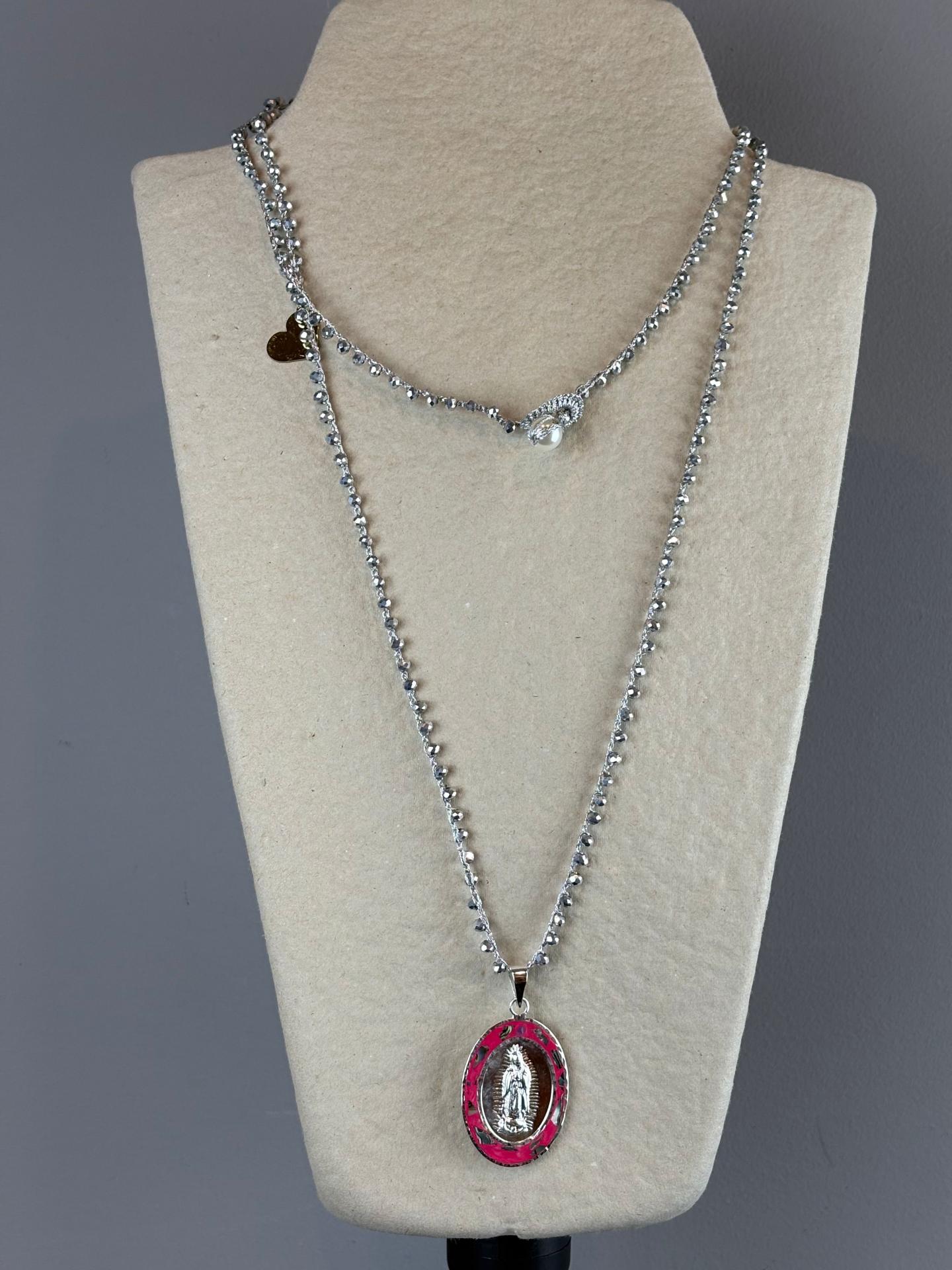El dije cuelga de un collar tejido completamente a mano, adornado con cristales corte Swarovski en color plata que aportan brillo y sofisticación. Su diseño versátil te permite usarlo en una, dos o hasta tres vueltas, adaptándose a distintos estilos y ocasiones.