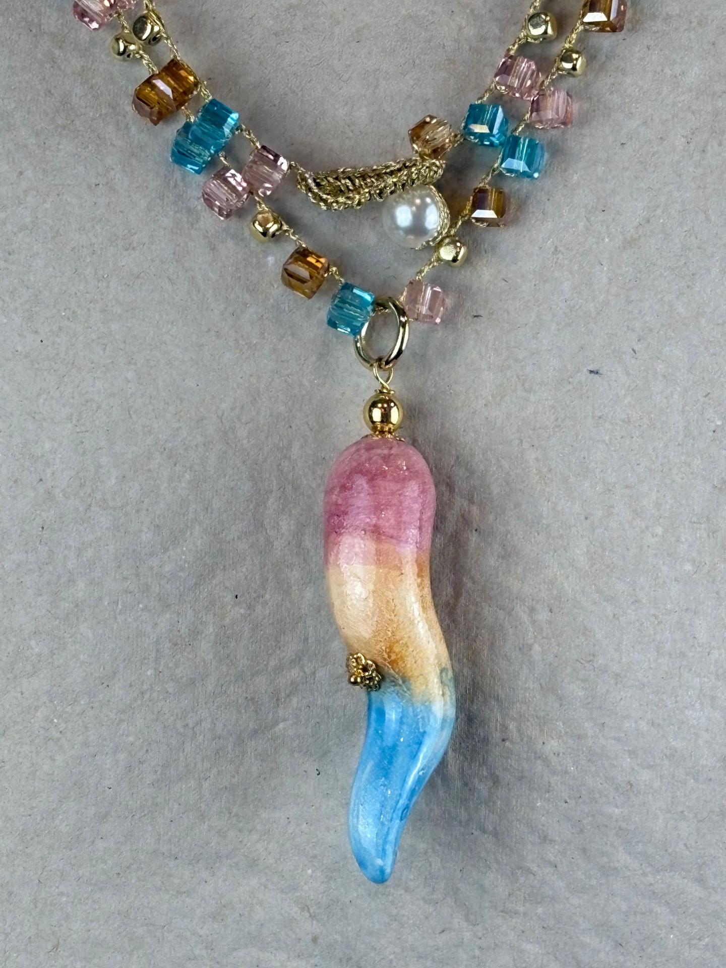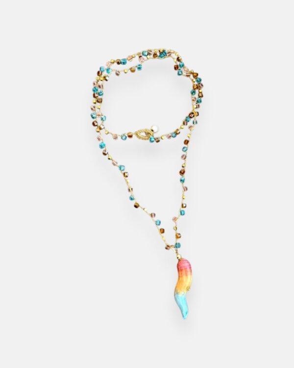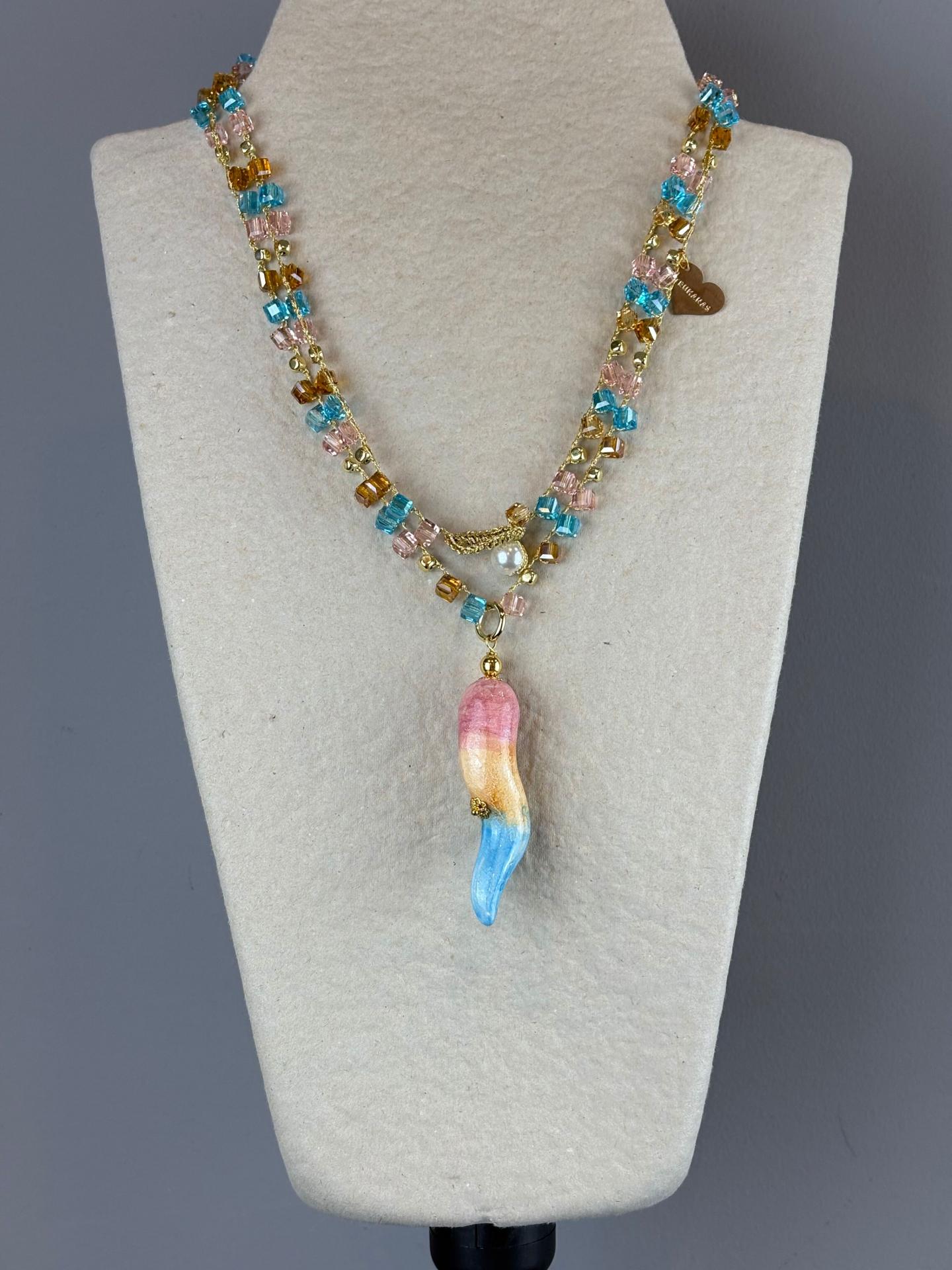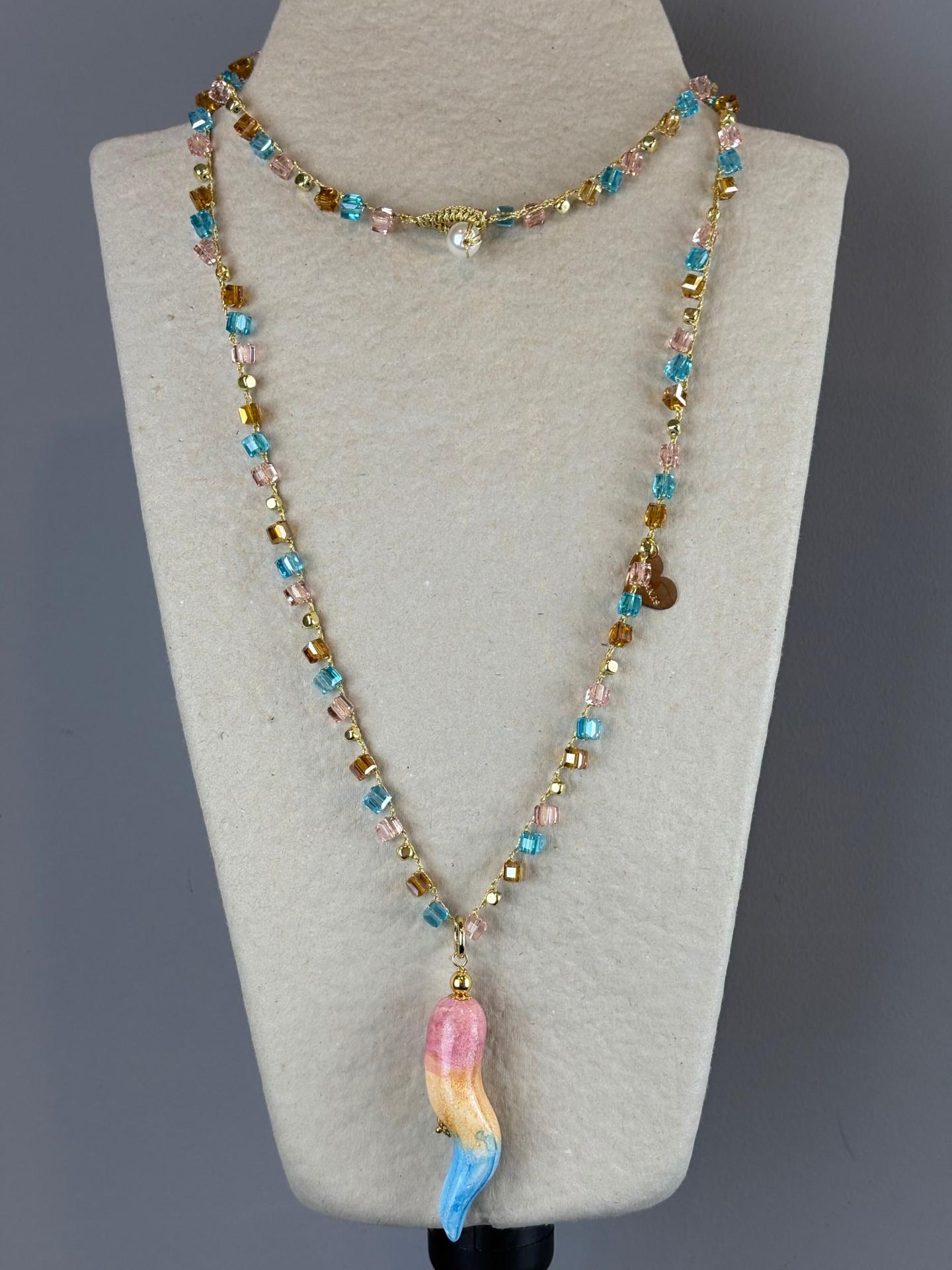 El Corno Sandro es una pieza artesanal hecha a mano en Italia, que combina tradición y diseño contemporáneo. Su colgante de cerámica, pintado a mano con un delicado degradado, cuelga de un collar largo tejido con cristales corte Swarovski en forma cuadrada, perfectamente armonizados en tono con el corno.