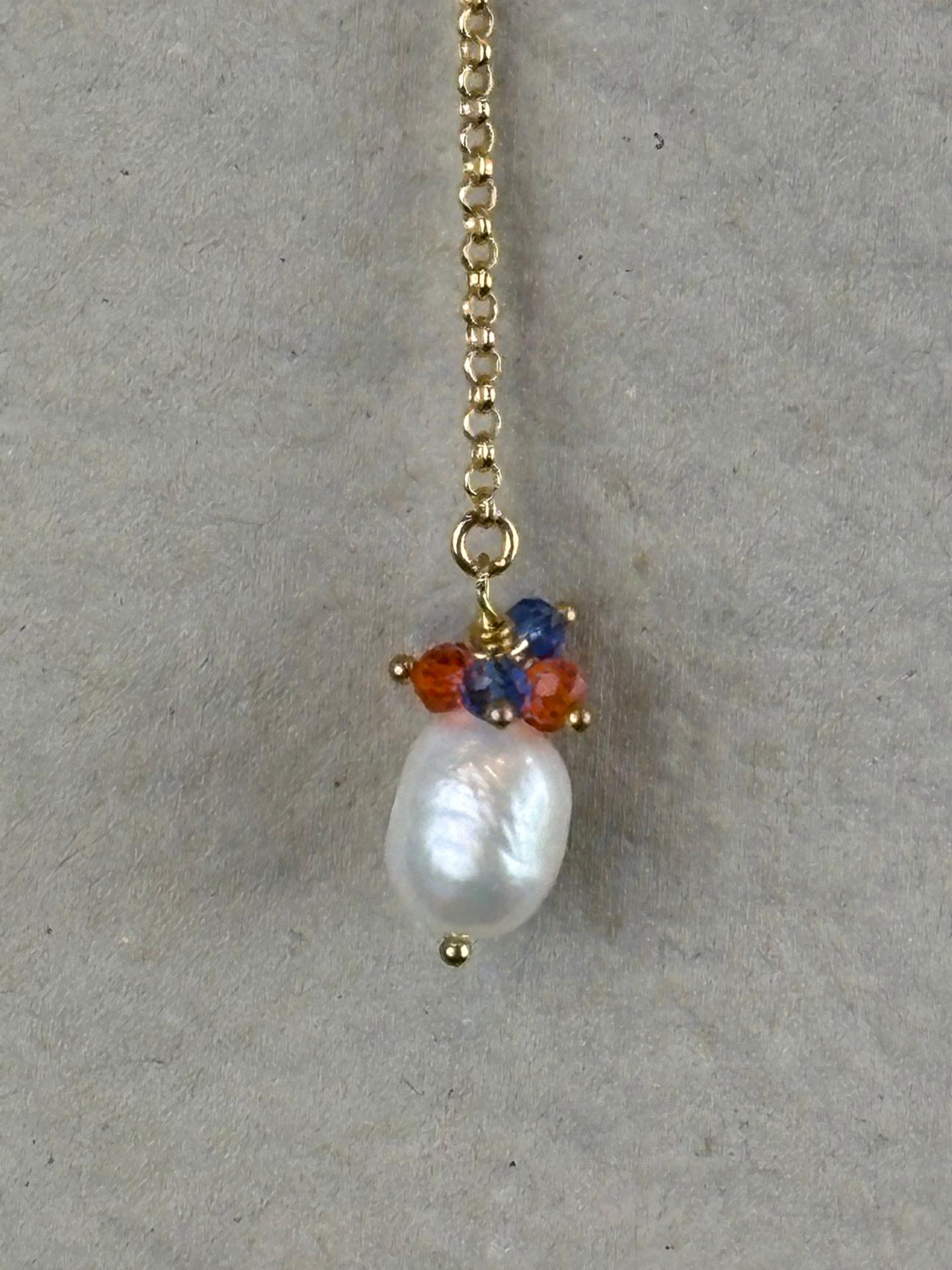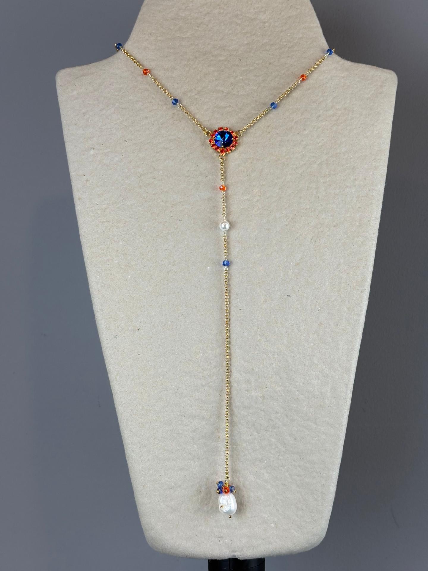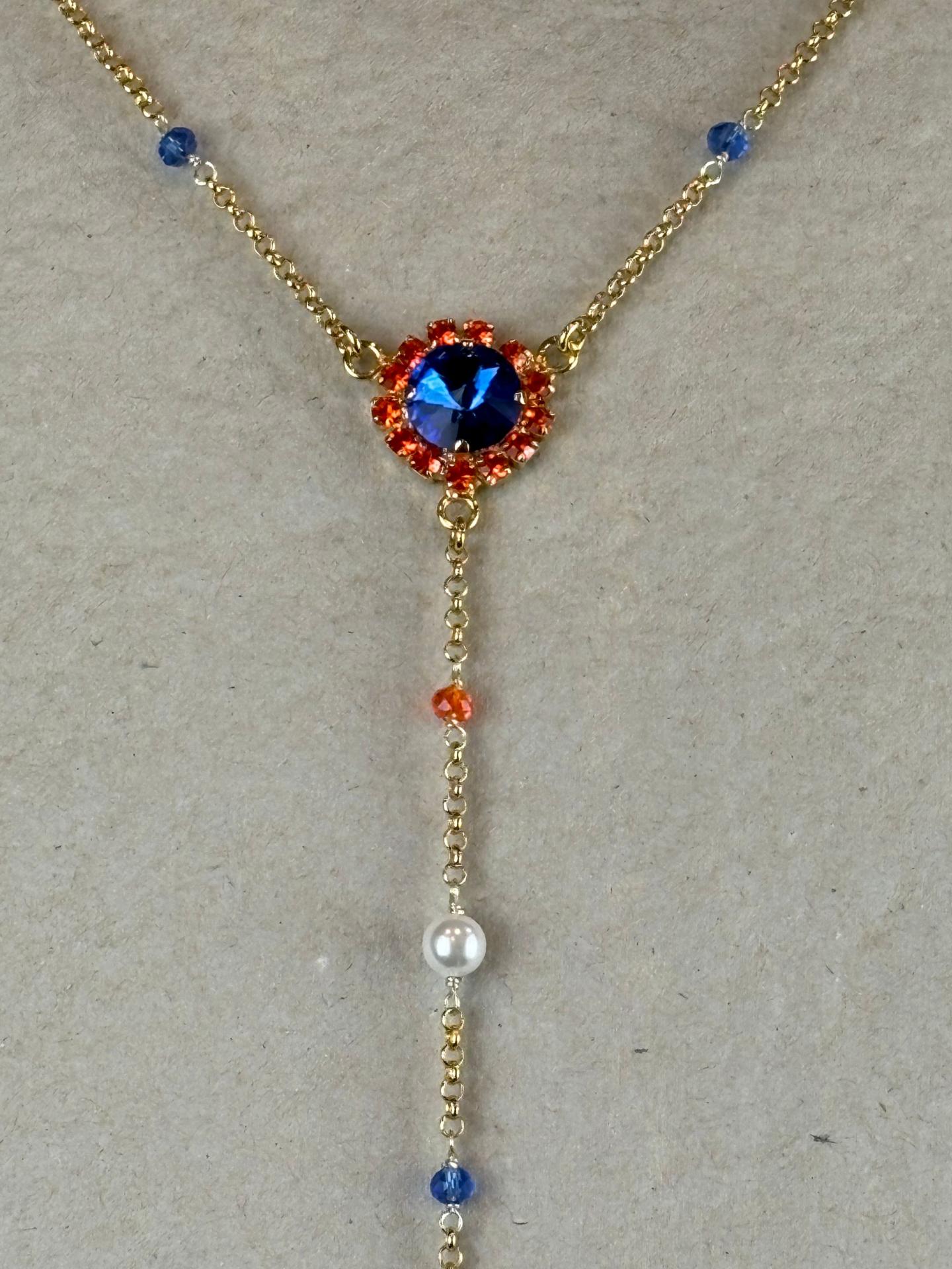 Su fina cadena de bronce galvanizado en oro se une en el centro con una elegante roseta de cristales Swarovski en dos tonos que aportan brillo y sofisticación. Desde esta pieza central desciende una delicada cadena decorada con pequeños cristales a juego, que culmina en una perla natural, aportando equilibrio y distinción al conjunto.