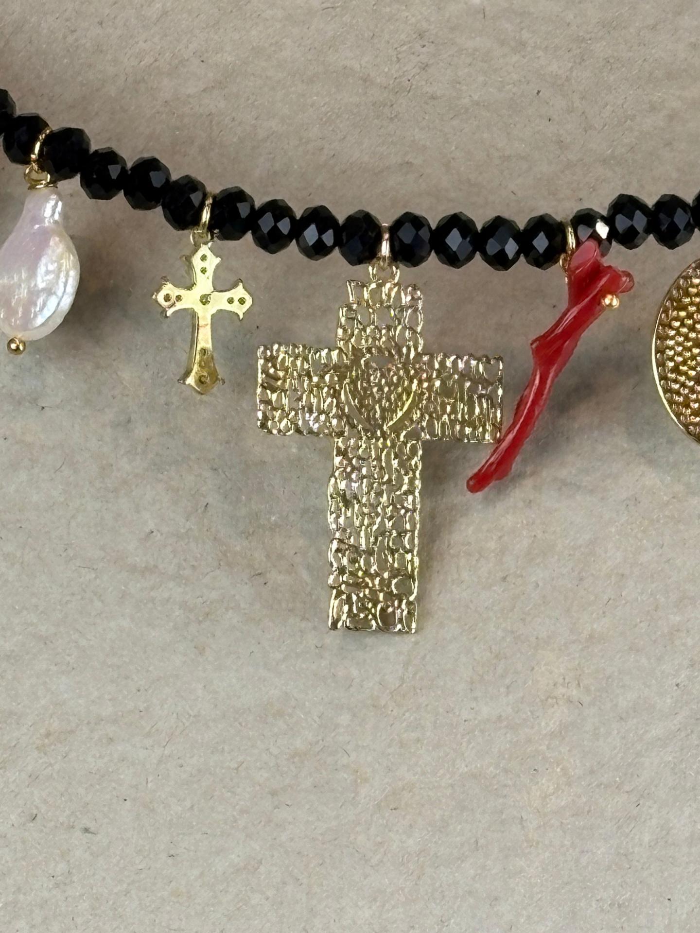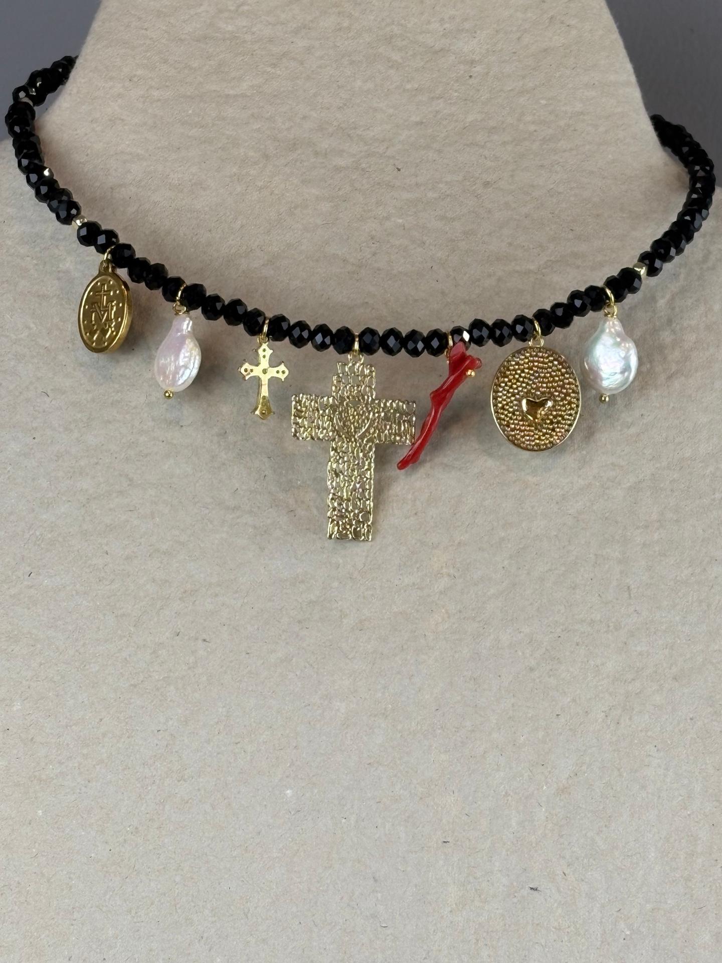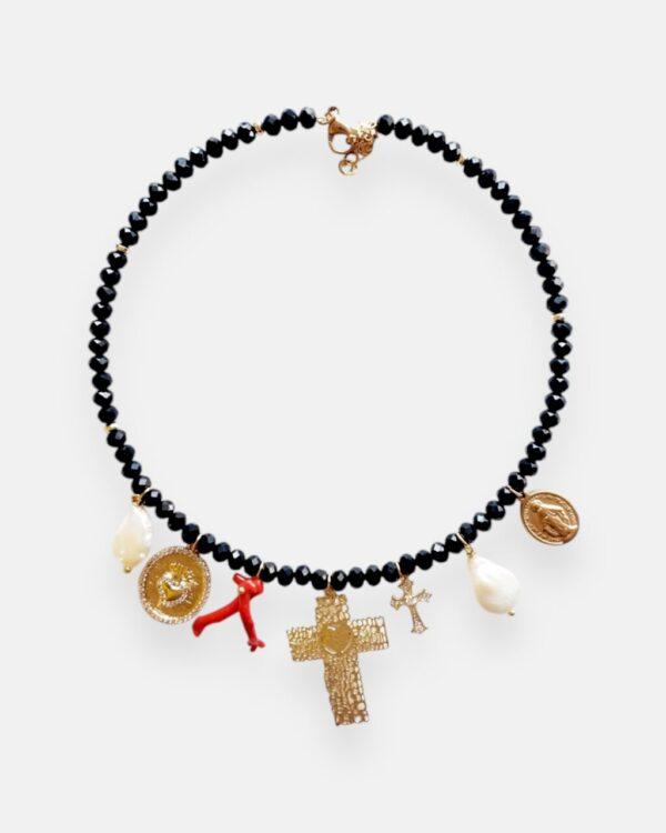 El collar Madonna es una pieza única y artesanal, elaborada a mano en Italia con materiales de alta calidad. Su estructura rígida se adapta con elegancia a cualquier tipo de cuello, gracias a una práctica cadena extensible que garantiza un ajuste perfecto. Confeccionado en cristal de corte Swarovski negro, este collar destaca por sus siete colgantes cuidadosamente seleccionados: una cruz central de gran presencia, dos perlas que aportan suavidad al diseño y una llamativa pieza de coral que añade un toque de color y originalidad, entre otros. Atrevido, desenfadado y con una personalidad arrolladora, el collar Madonna es una declaración de estilo. Un diseño espectacular que no encontrarás en ningún otro lugar.
