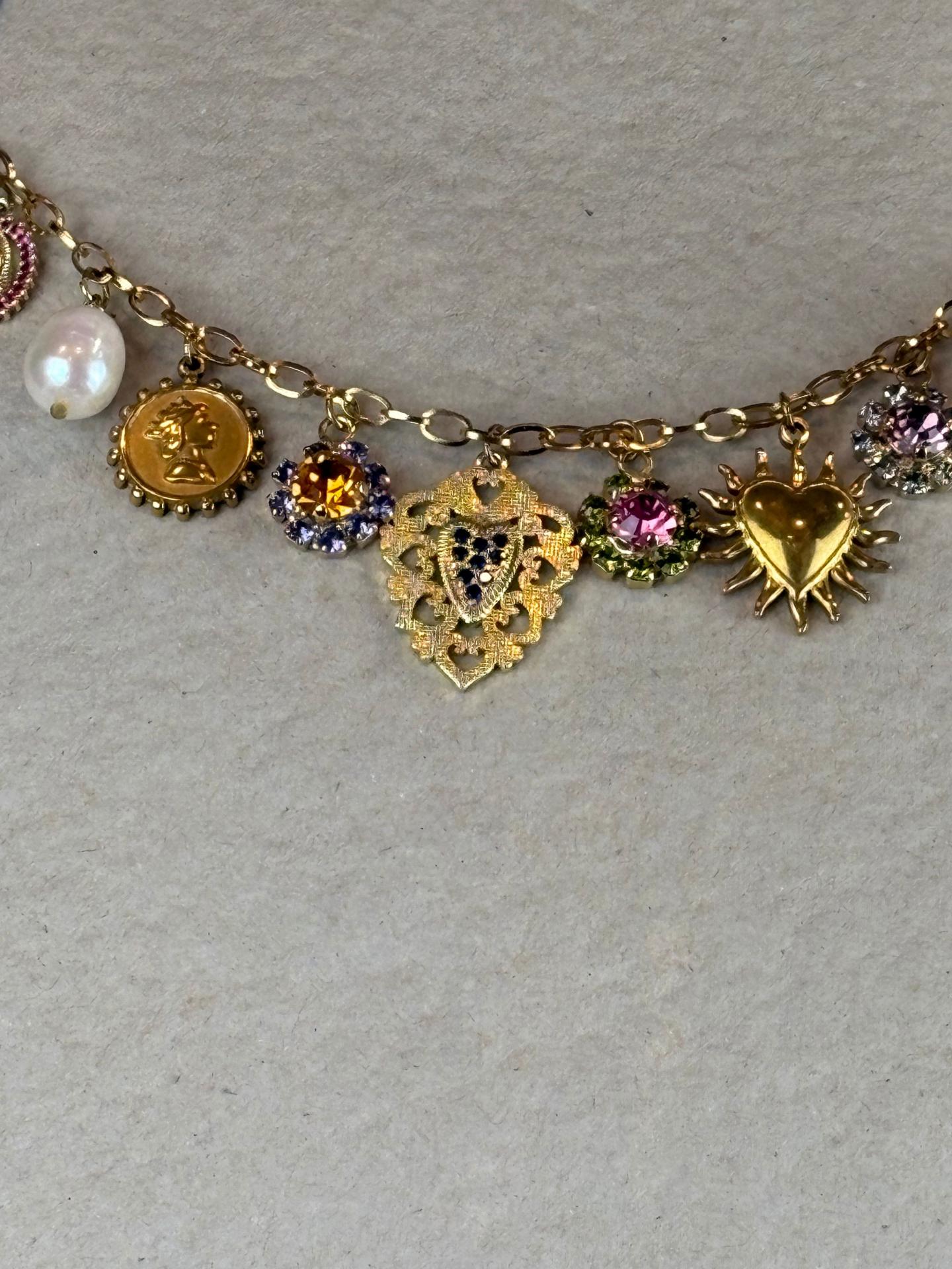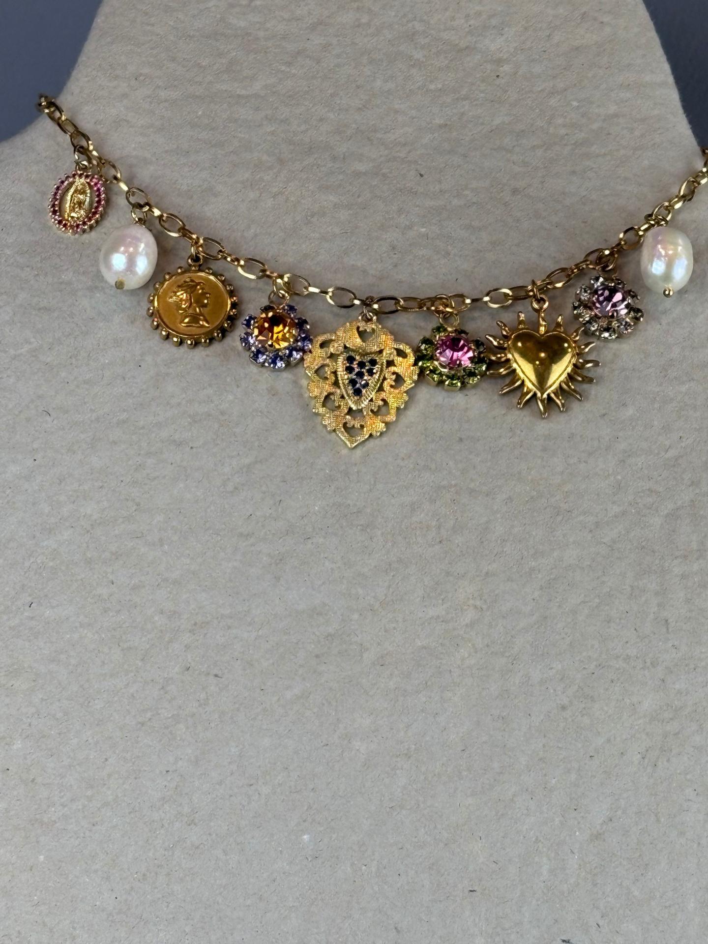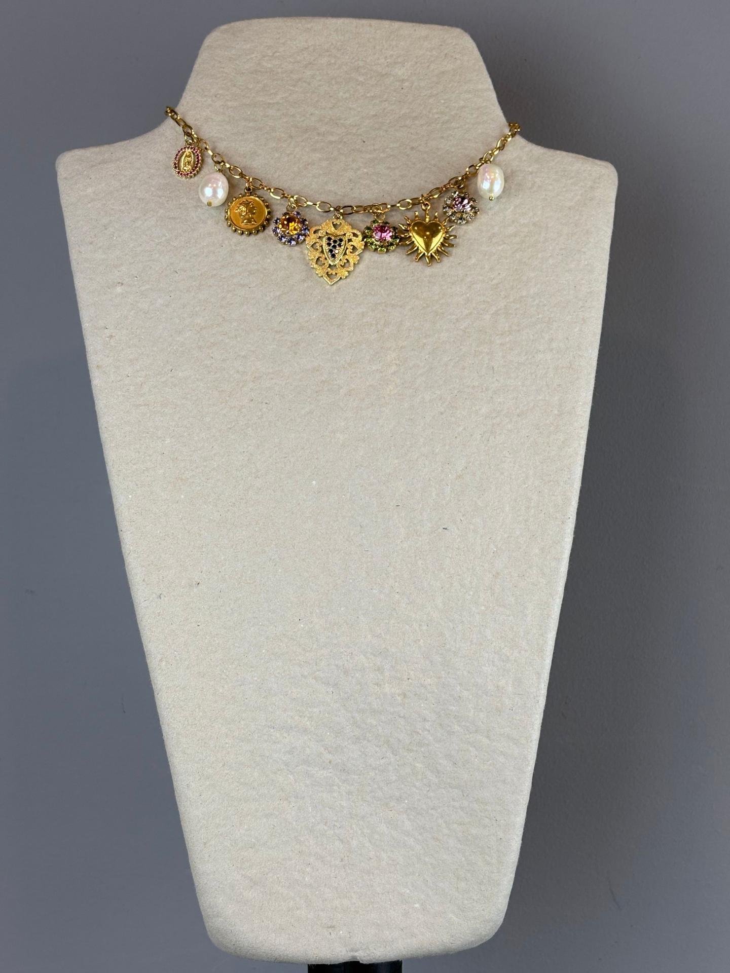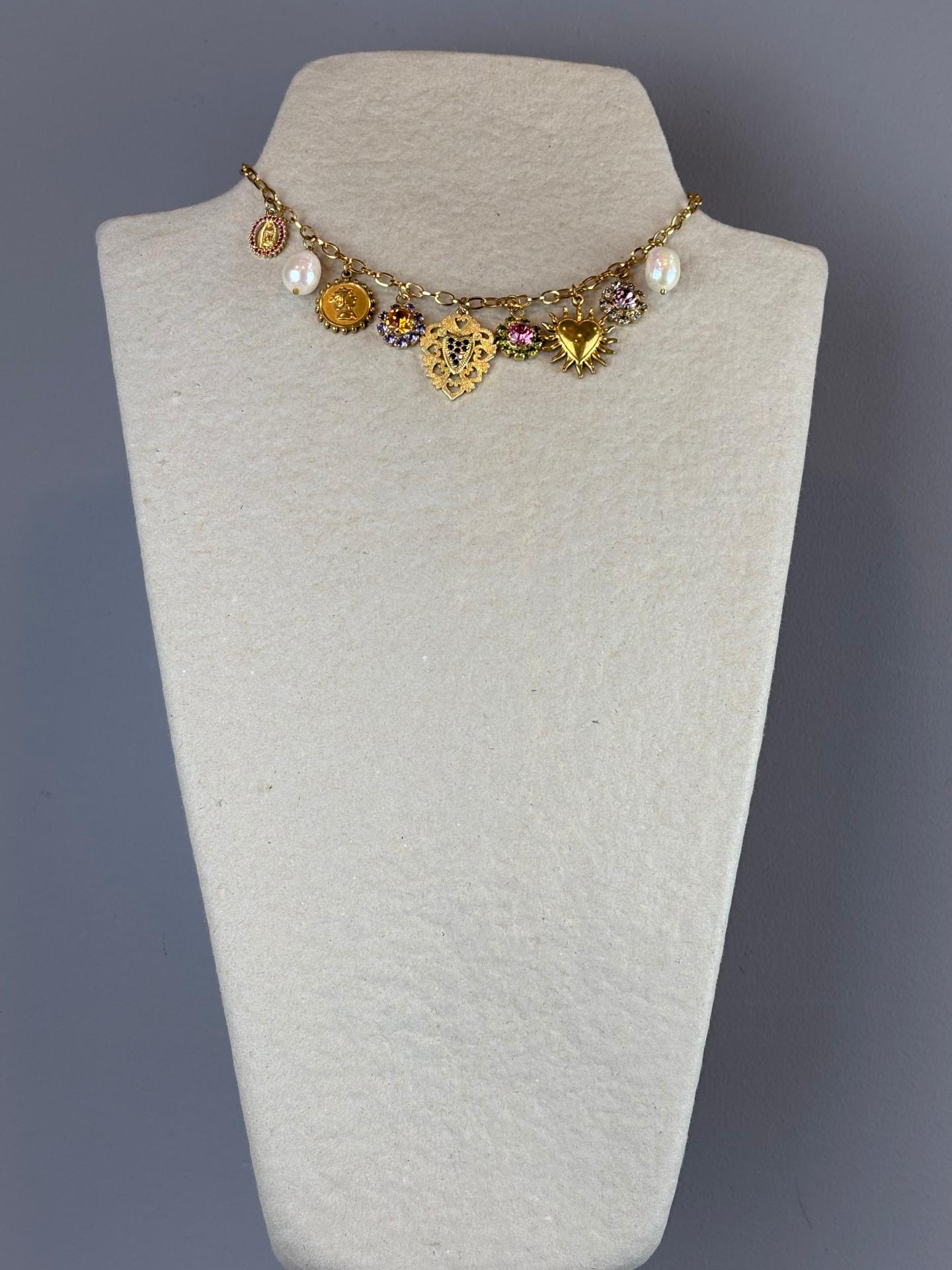 Collar Truhanas de cadena dorada con charms combinados: perlas, piezas esmaltadas y cristales de colores. Destacan sus colgantes de corazón y motivos joya que le aportan un estilo especial, elegante y con un punto vintage ideal para elevar cualquier look.