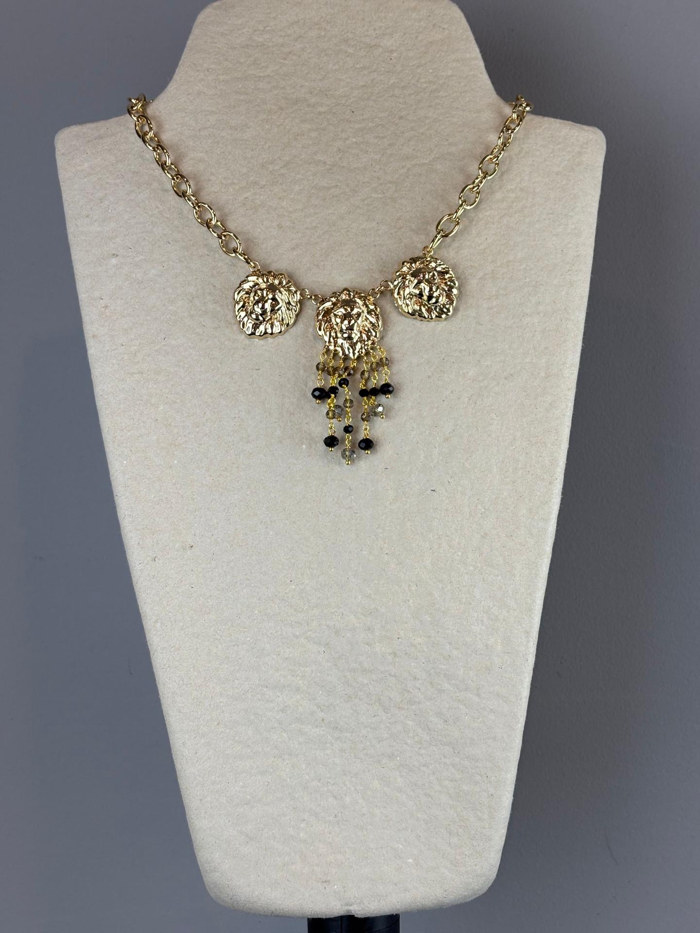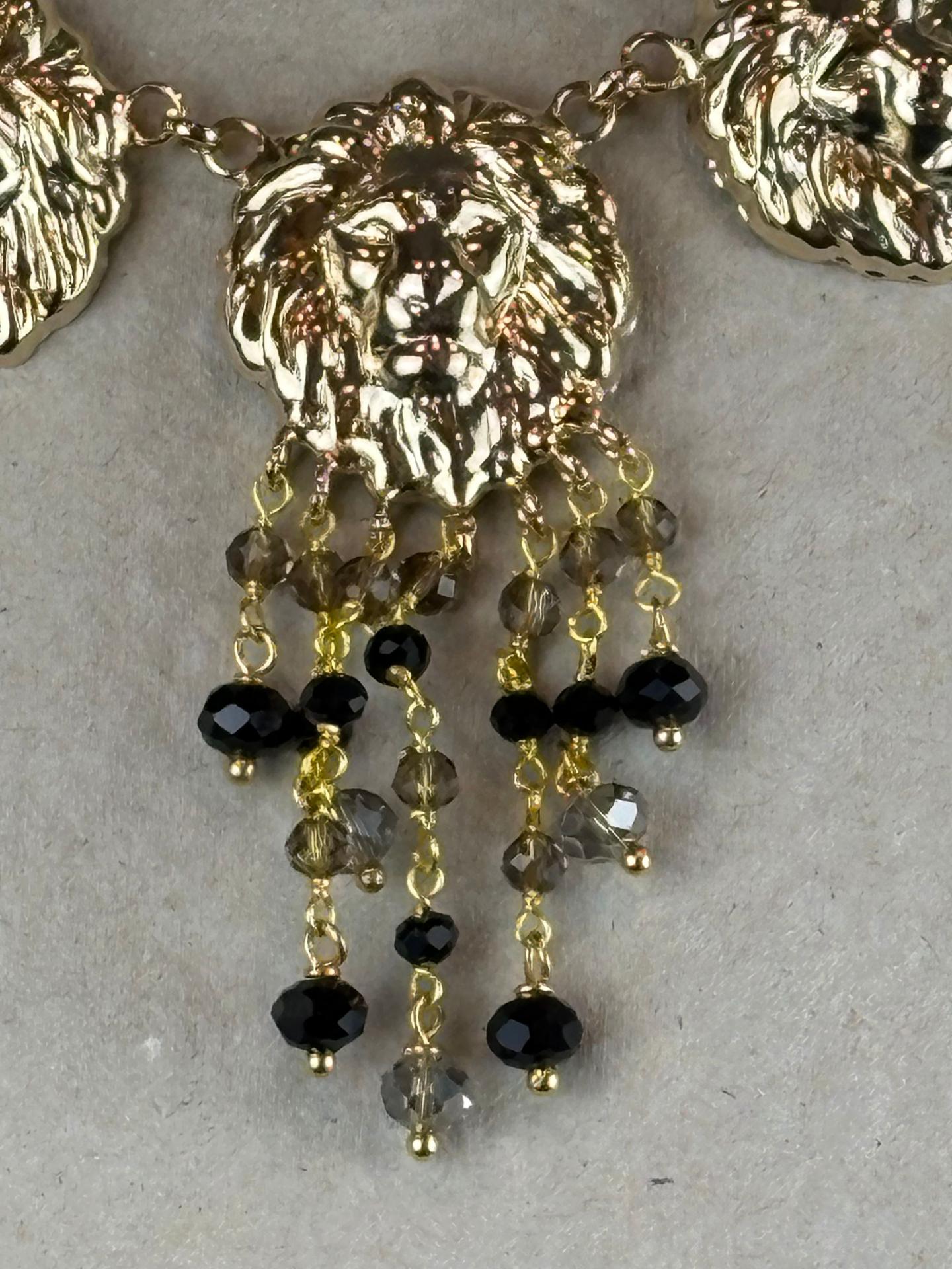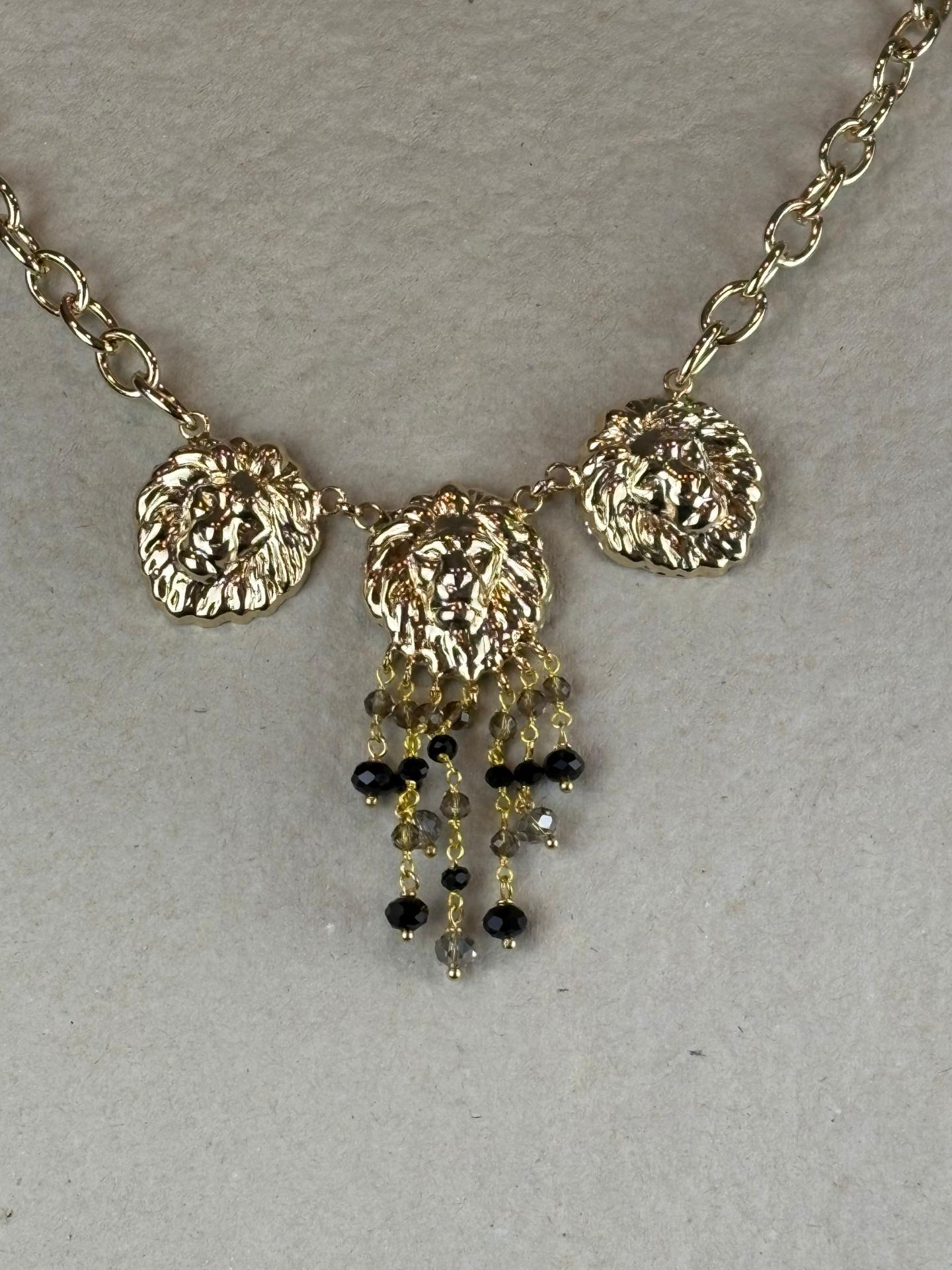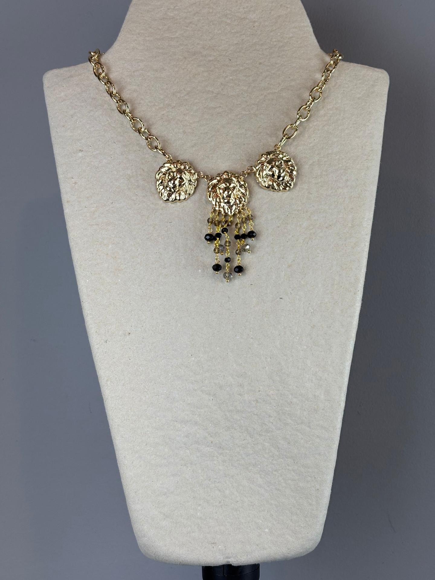 Collar Truhanas de cadena dorada con eslabón marcado y colgantes de león en relieve. Destaca su pieza central con caída de cuentas en tonos negros y marrones que aportan movimiento. Un diseño potente y sofisticado.