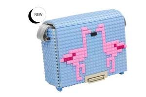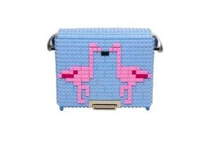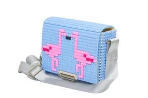 Bolso cuadrado con solapa y cierre metálico con tapa en color azul claro con el diseño de la foto.