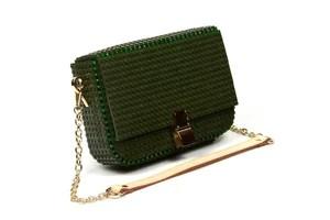 Bolso con cierre con forma de clip, correa de piel y cadena metálica de quita y pon en color verde oliva con el diseño de la foto.