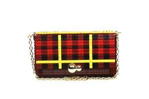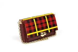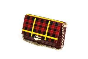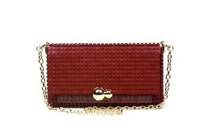Cartera con forma cuadrada, cierre metálico con forma de piedras y cadena metálica de quita y pon en color granate con el diseño de la foto.