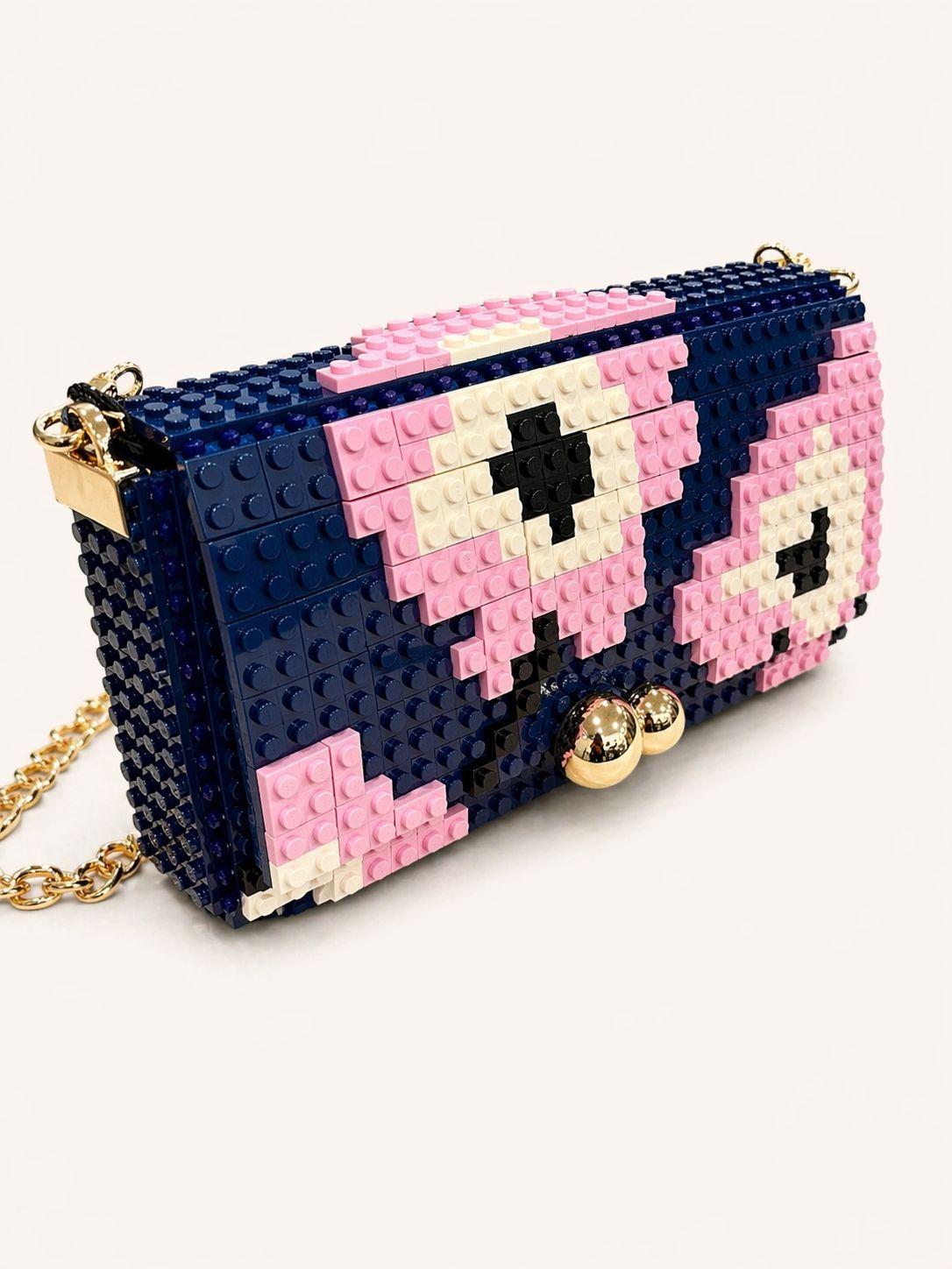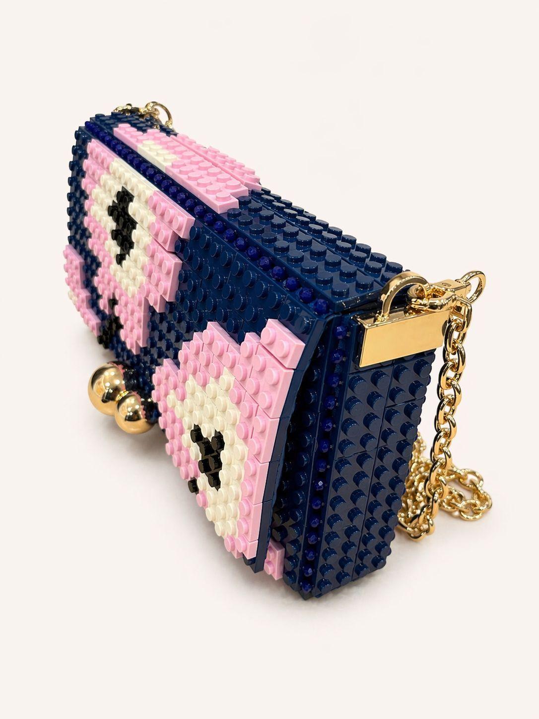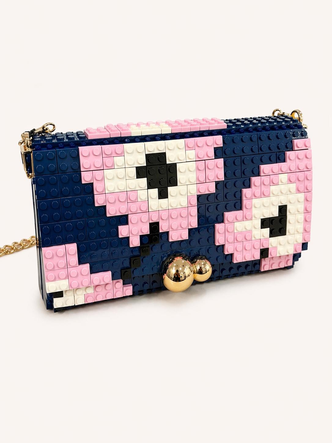 Dimensiones 25cm x 13cm x 6cm. Peso 370gr + 130gr la cadena metálica. Formado por 266 bloques de ABS ensamblados a mano. Incluye funda guardapolvo de algodón, bolsillo interior y cadena metálica de quita y pon de 105 cm de longitud.