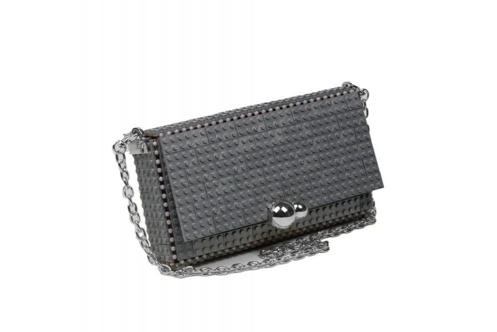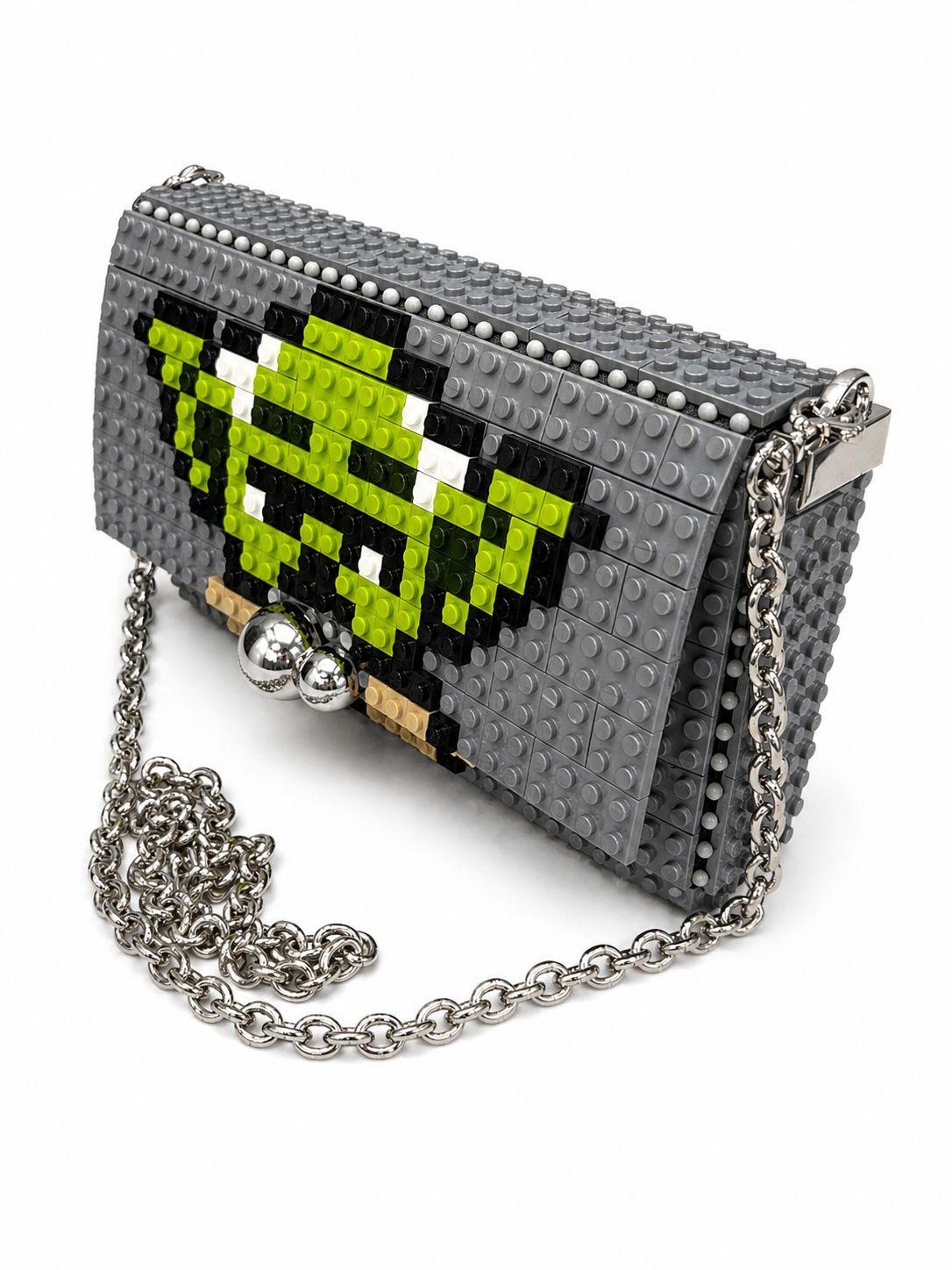 Bolso de mano pequeño cuadrado con cierre de piedras y cadena metálica.