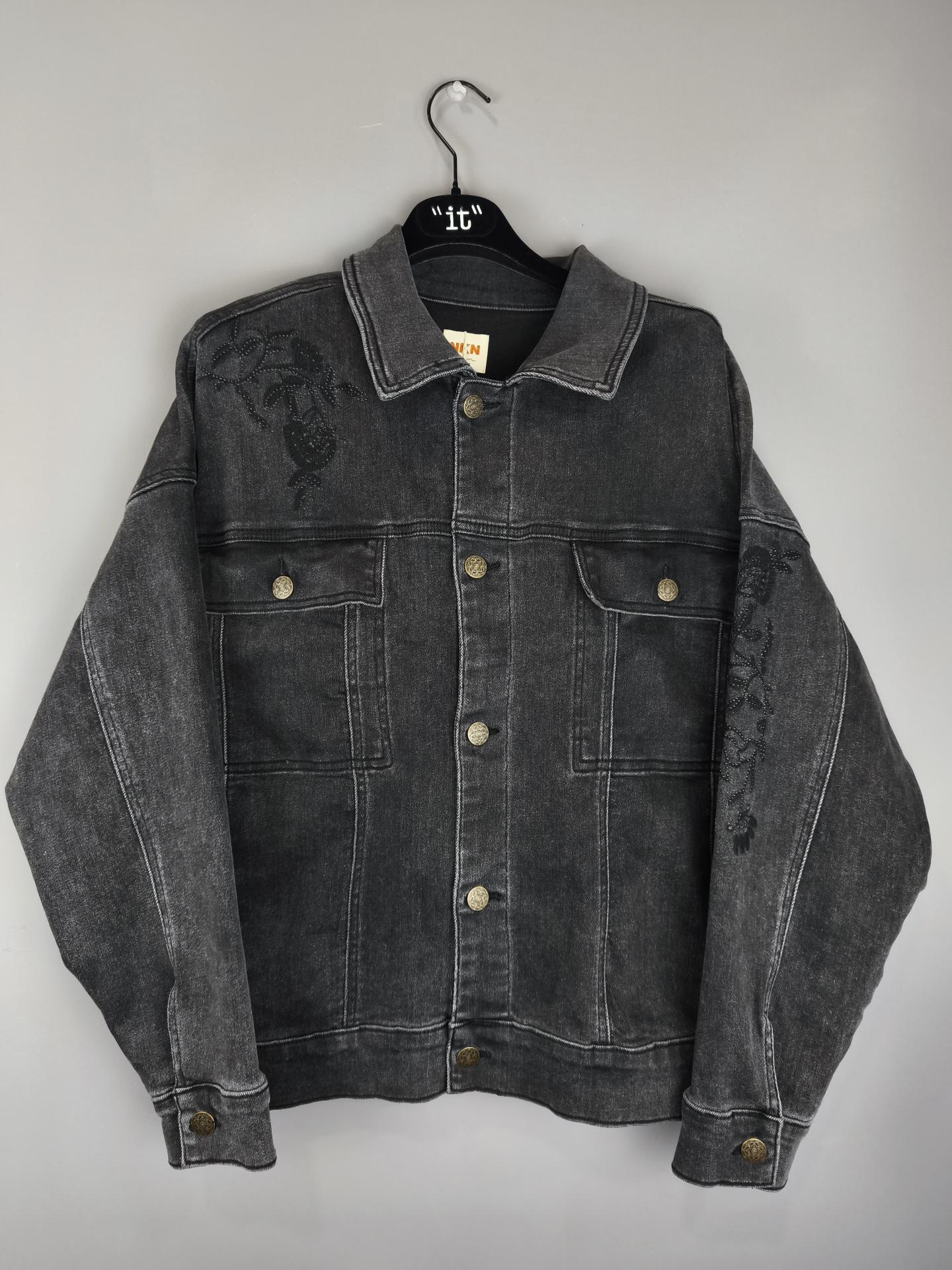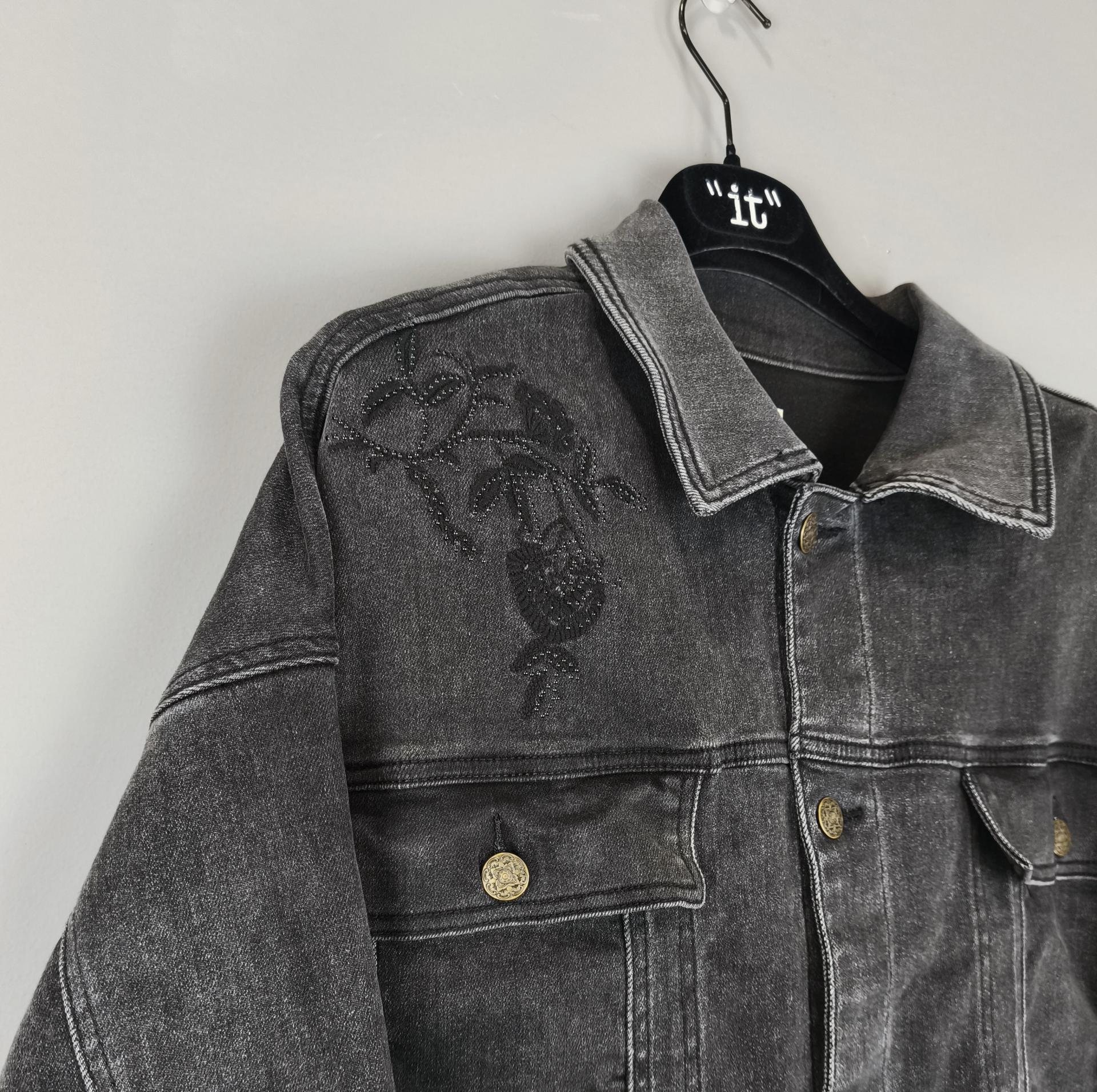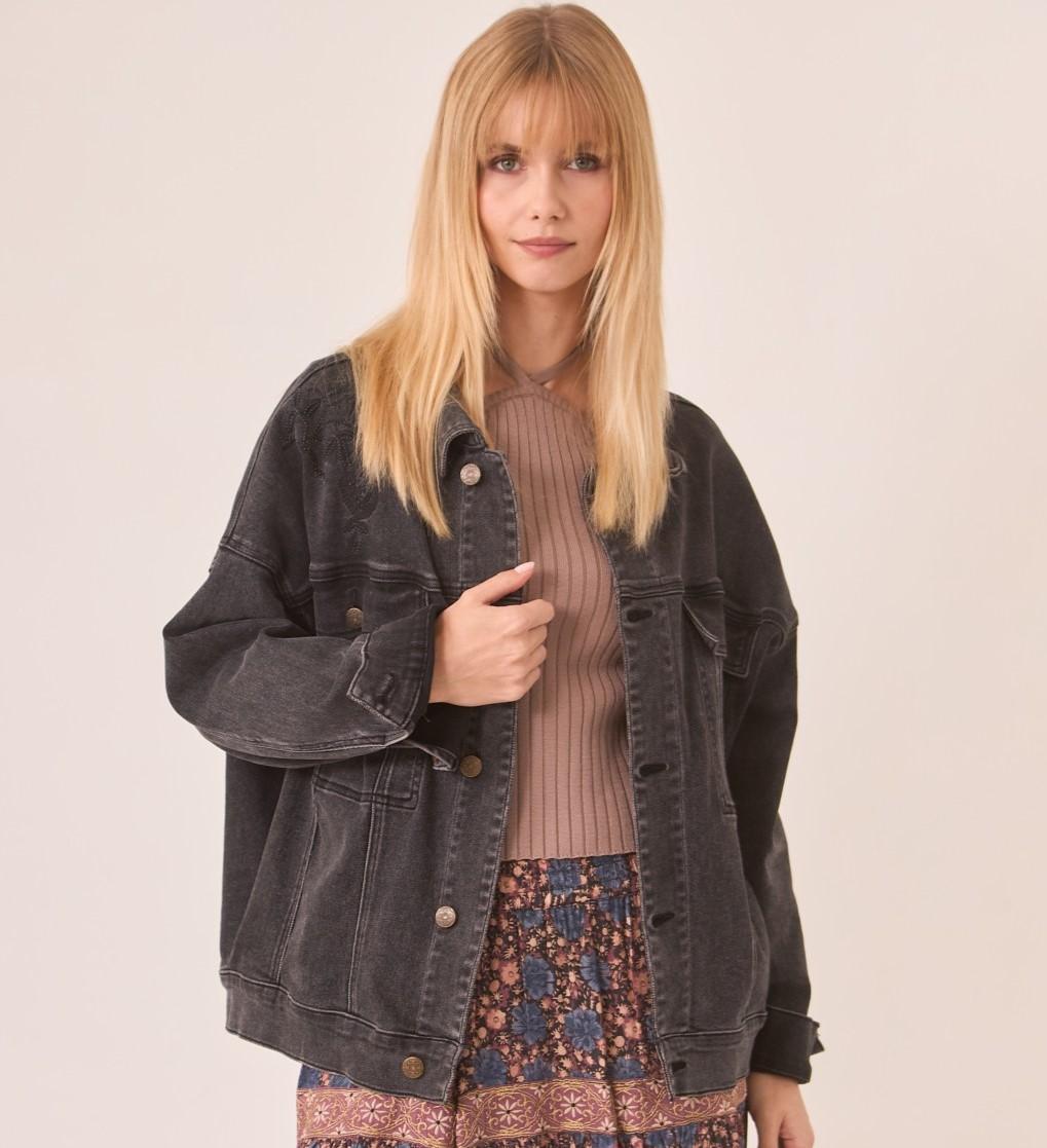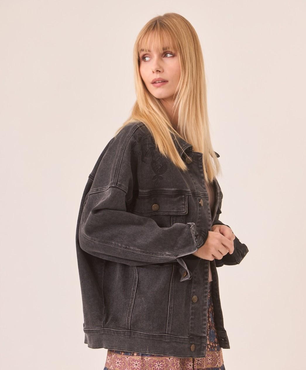 Chaqueta oversized en tejido denim con detalle de bordados florales en las mangas.