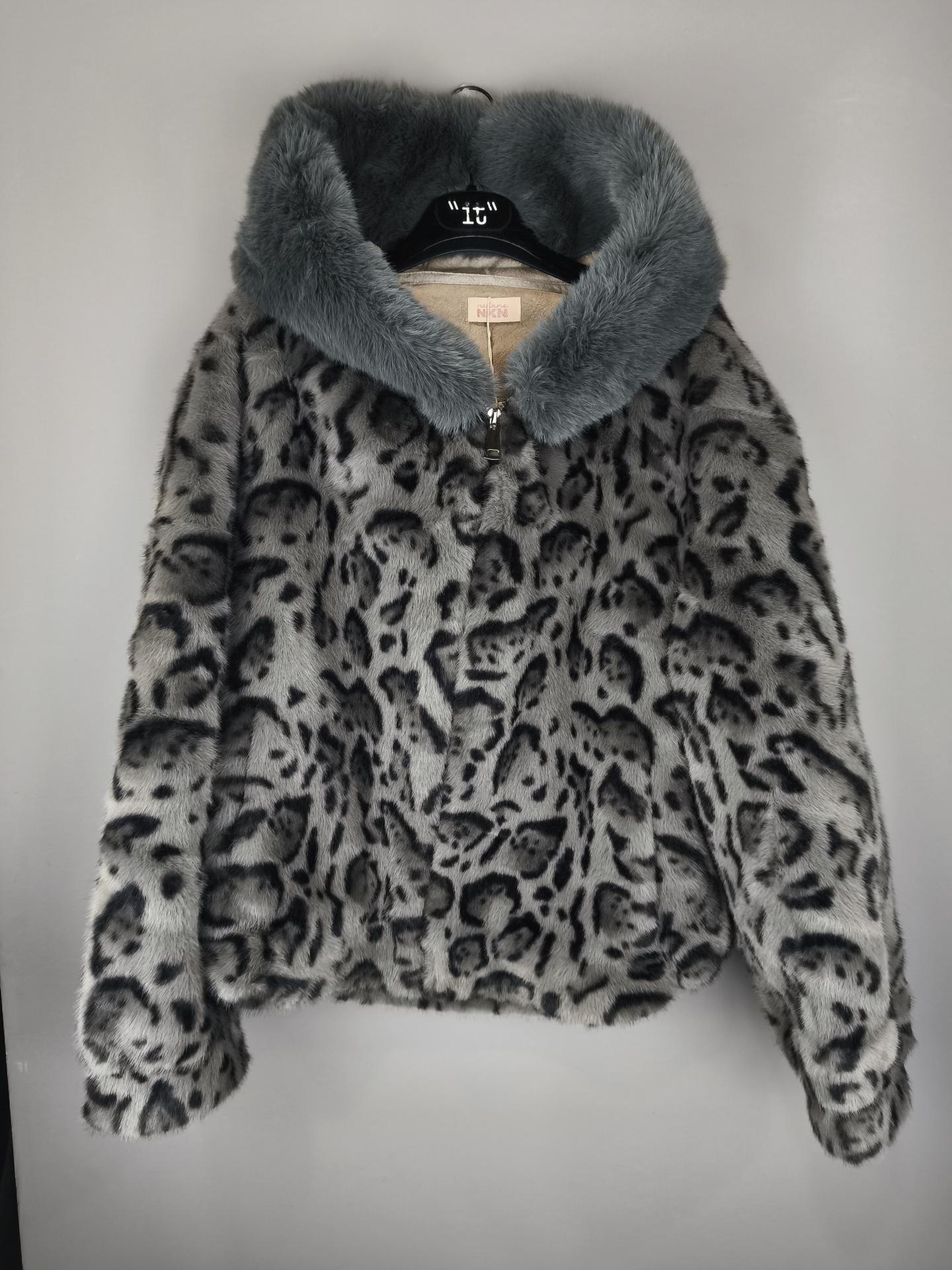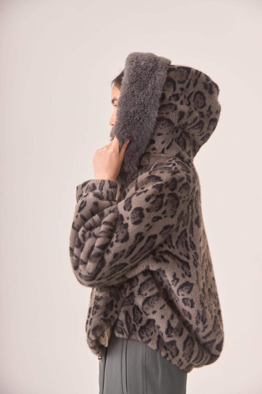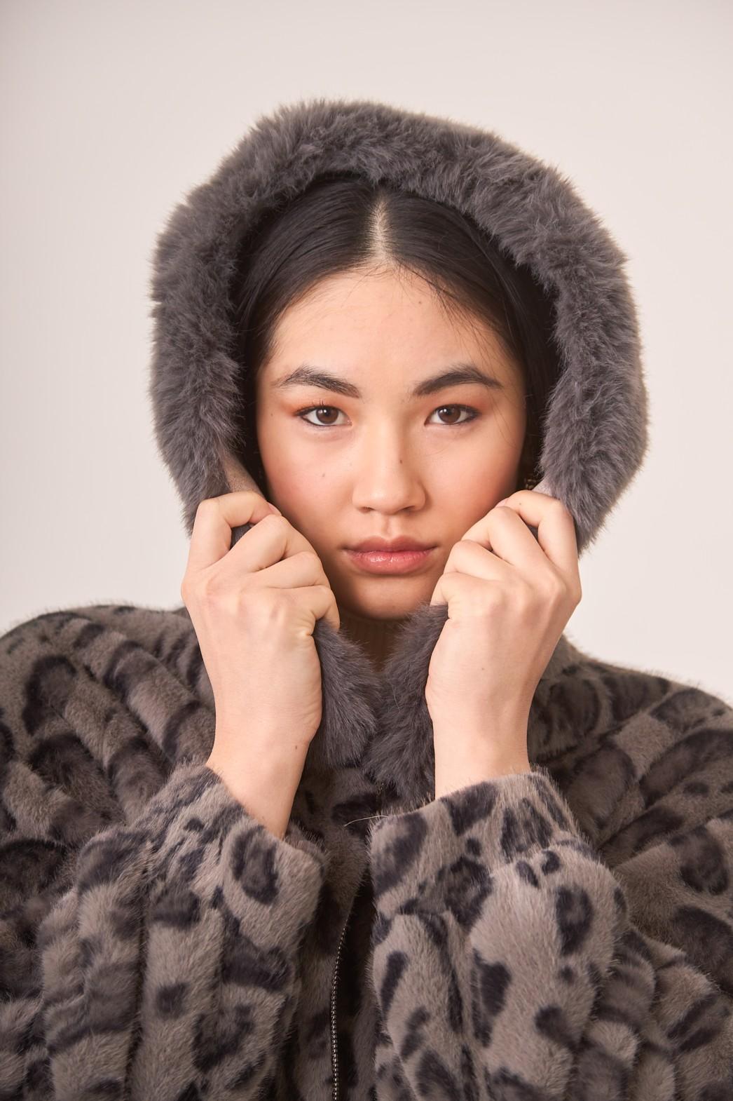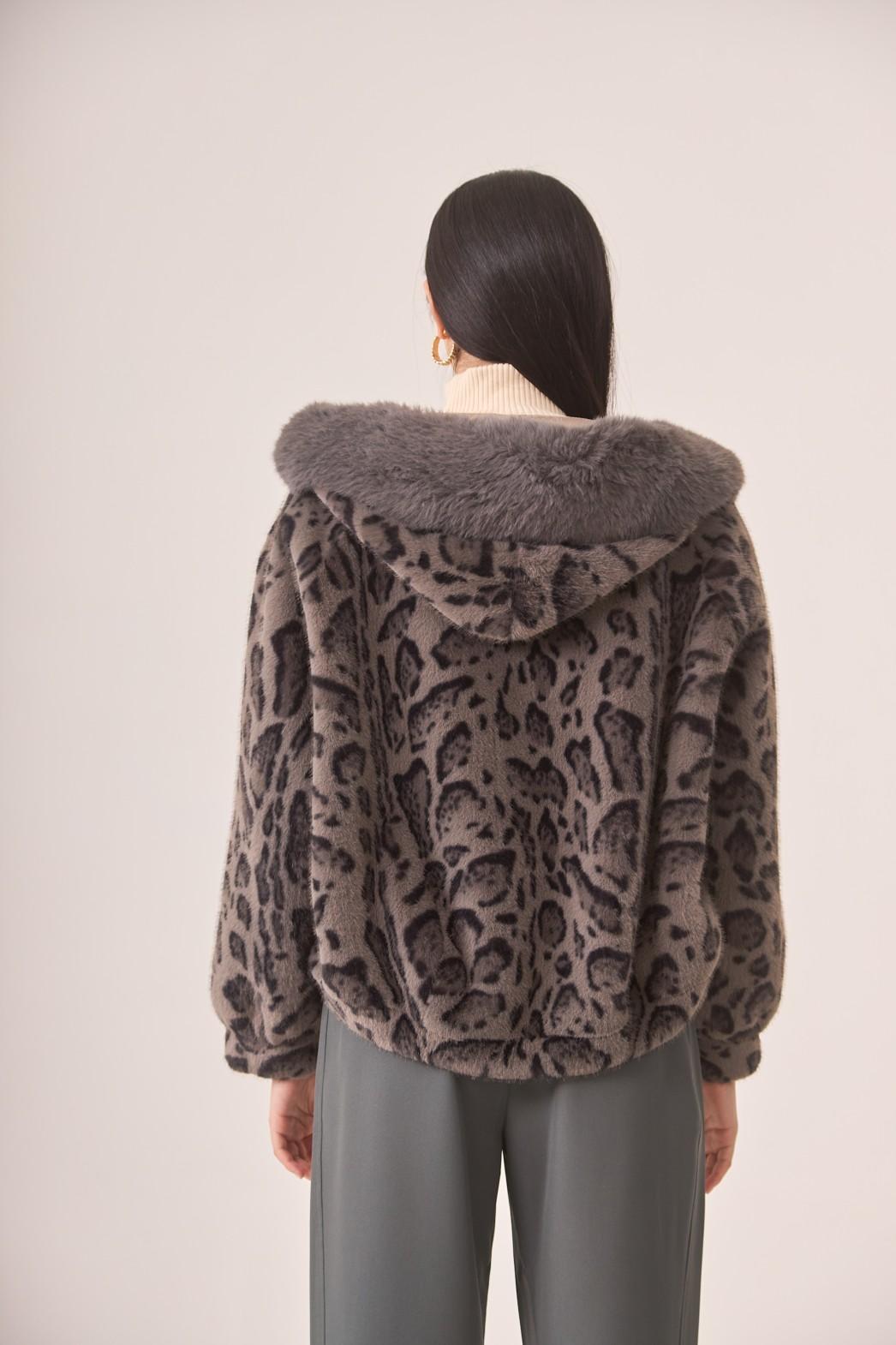 Abrigo corto de pelo estampado con print animal. Con capucha y bolsillos. Cierre de cremallera.