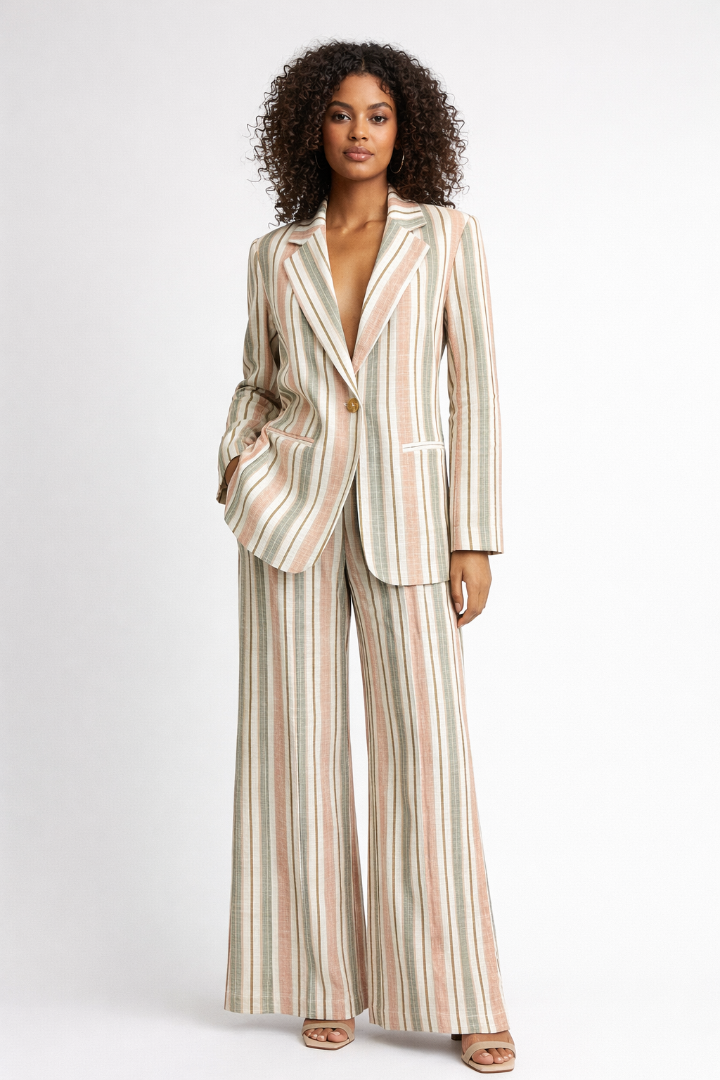 Traje de dos piezas corte masculino , estampado de rayas en colores suaves y cálidos.