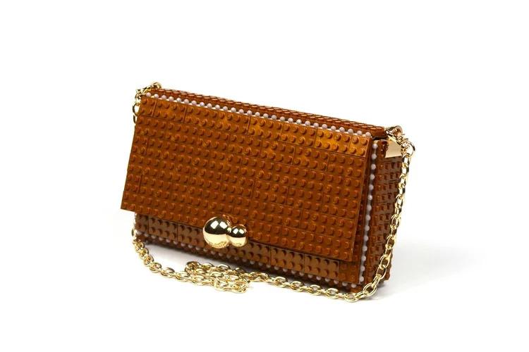 Dimensiones: 25 cm x 13 cm x 6 cm. Peso: 370 g + cadena metálica de 130 g. Se adapta perfectamente a cualquier iPhone. 196 bloques de ABS ensamblados a mano + bloques superiores de entrada y salida. Incluye bolsa de algodón, bolsillo interior y cadena metálica de entrada y salida de 105 cm.