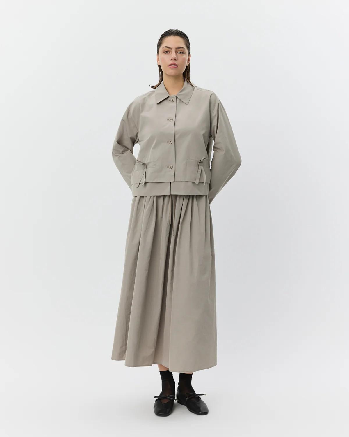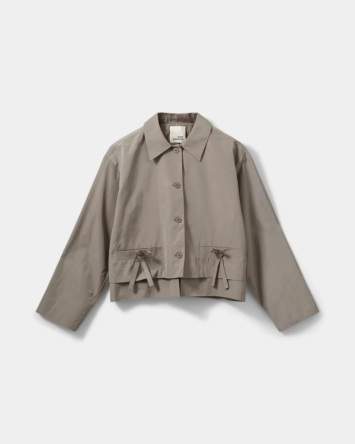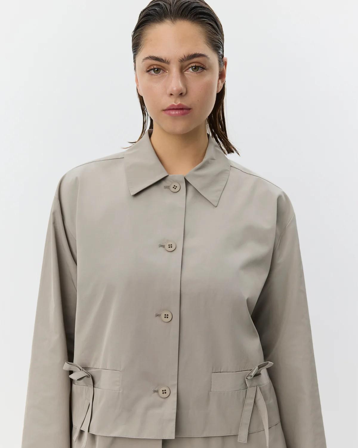• Dos bolsillos delanteros decorativos con tiras para atar
