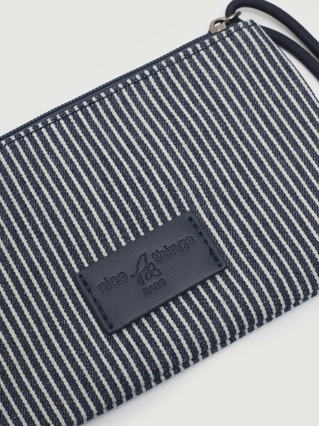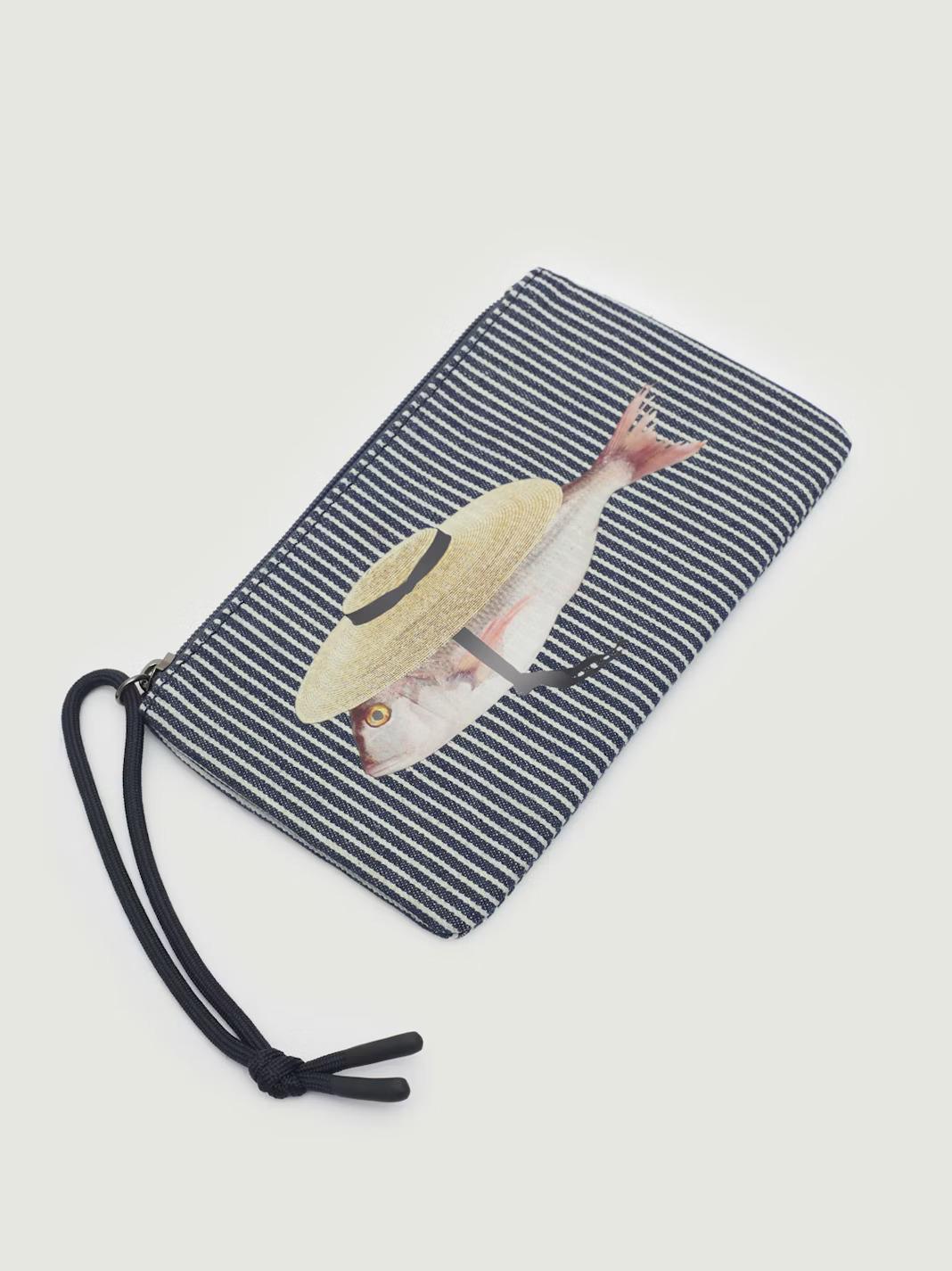 Bolsa plana estampada de rayas con motivo de pez. Cuenta con cierre de cremallera, interior con compartimentos para tarjetas y tirador de cordón para sujeción en la muñeca. Logo grabado. Medidas: 14 cm de alto × 21 cm de ancho.