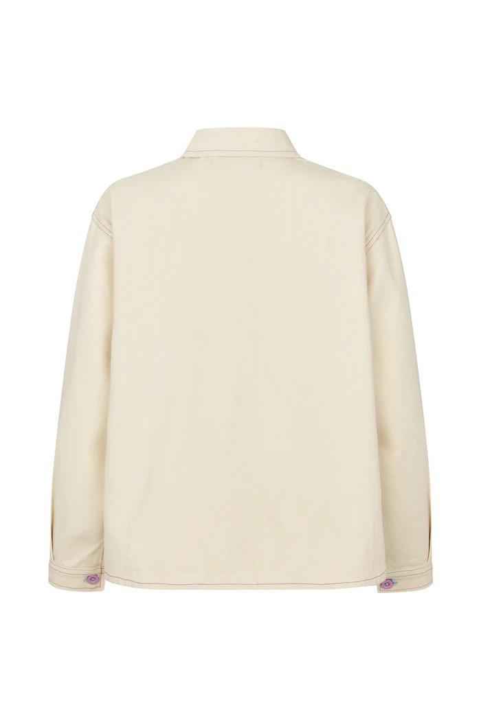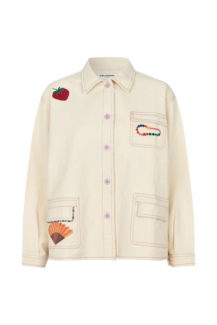 La chaqueta AprilLL. Hecha 100 % de algodón suave con costuras moradas en contraste, los coloridos detalles bordados la hacen única y llena de personalidad: un ejemplo perfecto del universo creativo de Lollys Laundry.