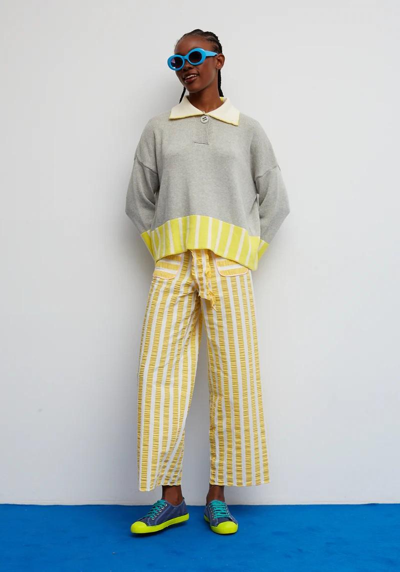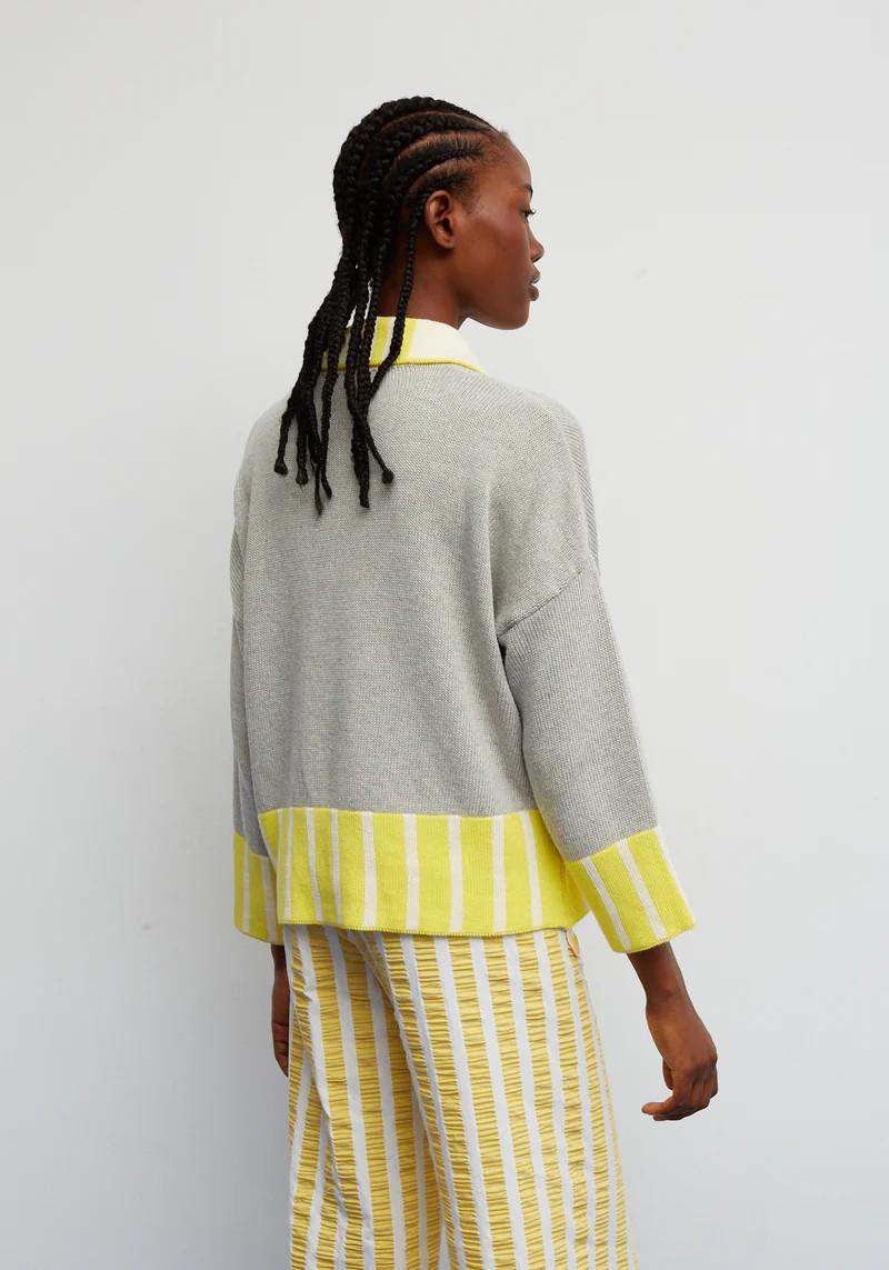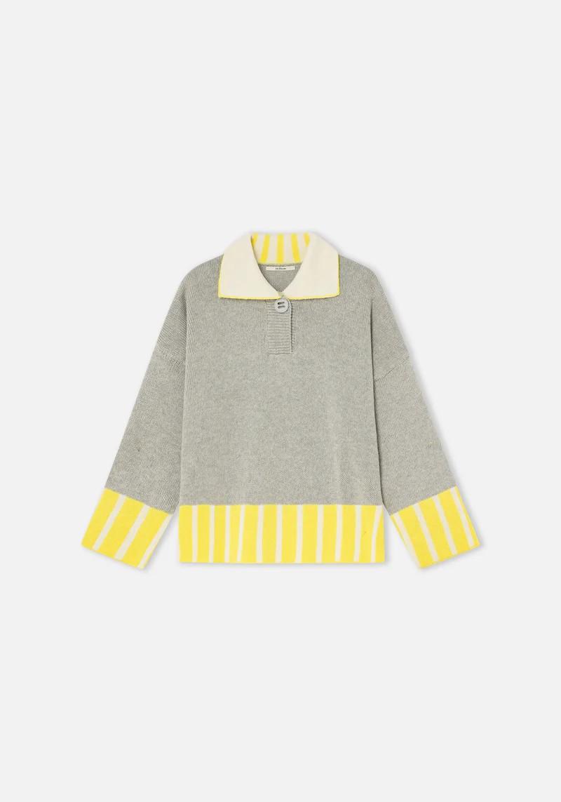 Jersey con espíritu retro que combina un cuerpo en tono gris, con rayas amarillas y blancas en el bajo y los puños, creando un contraste fresco y lleno de energía. El cuello tipo polo, rematado con un botón de madera y desenfadado, que lo hace especial sin perder comodidad. Con su silueta recta, caída natural y tejido suave, es una prenda perfecta para el día a día: cómoda, favorecedora y con mucha personalidad.
