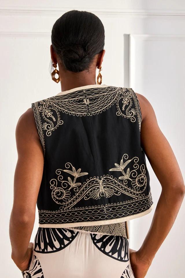 Chaleco corto con detalles paisley y florales bordados en contraste de color.
